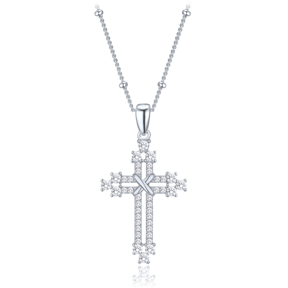 MINET Stříbrný náhrdelník křížek se zirkony a řetízek s kuličkami