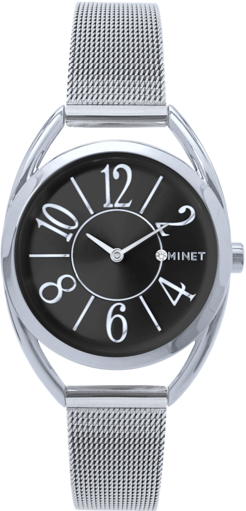 MINET Černo-stříbrné dámské hodinky s čísly ICON BLACK se stříbrným ocelovým řemínkem