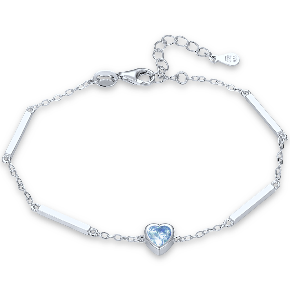 Stříbrný náramek MINET se srdcem je vyroben ze stříbra Ag 925/1000 s rhodiovaným povrchem, který pomáhá udržet jeho barvu i lesk. Světle modrý zirkon dodává jemný barevný akcent a decentní styl je vhodný pro každodenní i elegantní nošení.