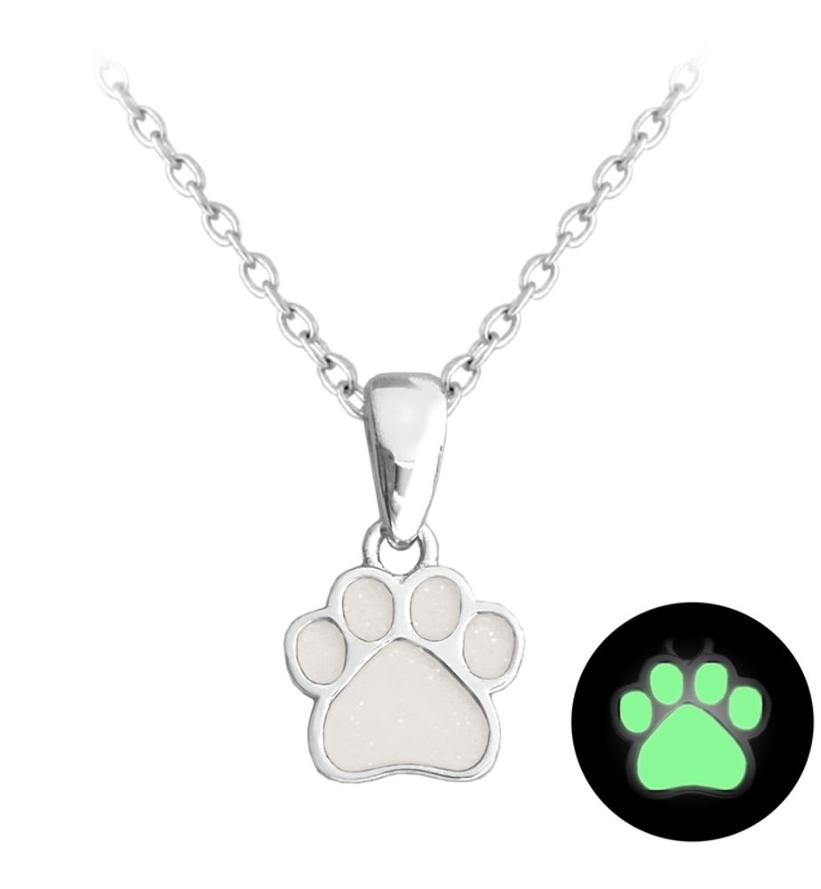 MINET Svítící bílý dětský stříbrný náhrdelník TLAPKA