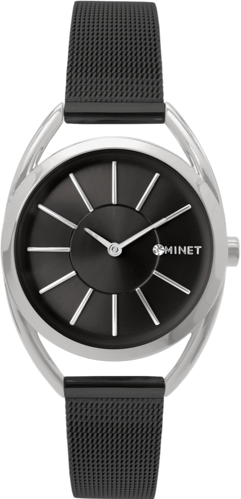 Elegantní hodinky české značky MINET s černým číselníkem, vyměnitelným černým ocelovým řemínkem milánského typu a s detaily ve stříbrné barvě. Hodinky jsou vyrobeny z hypoalergenní nerezové oceli.