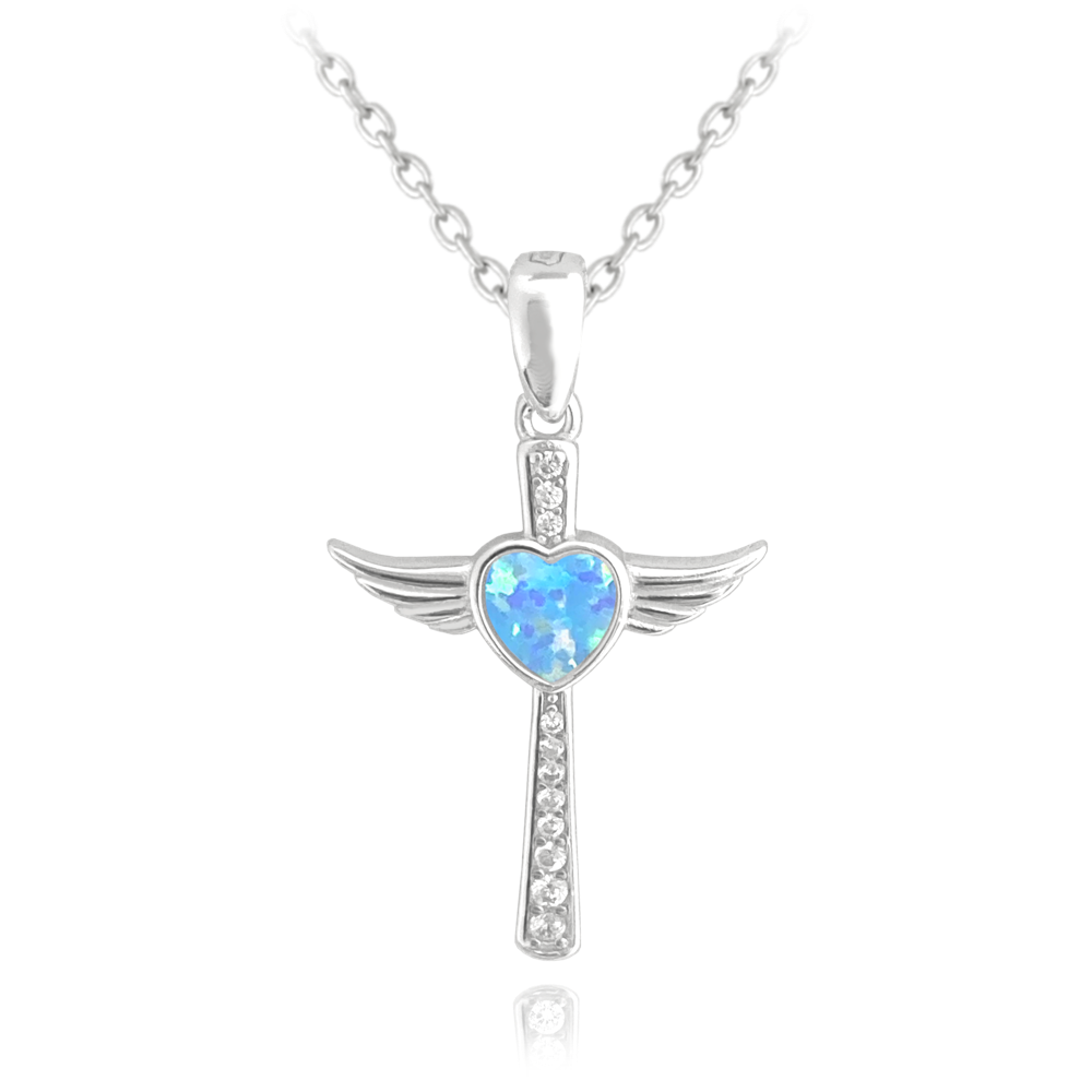 MINET Stříbrný náhrdelník ANDĚLSKÝ KŘÍŽEK s modrým opálovým srdíčkem