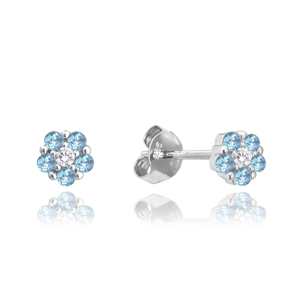 MINET Dětské stříbrné náušnice KYTIČKY se světle modrými zirkony