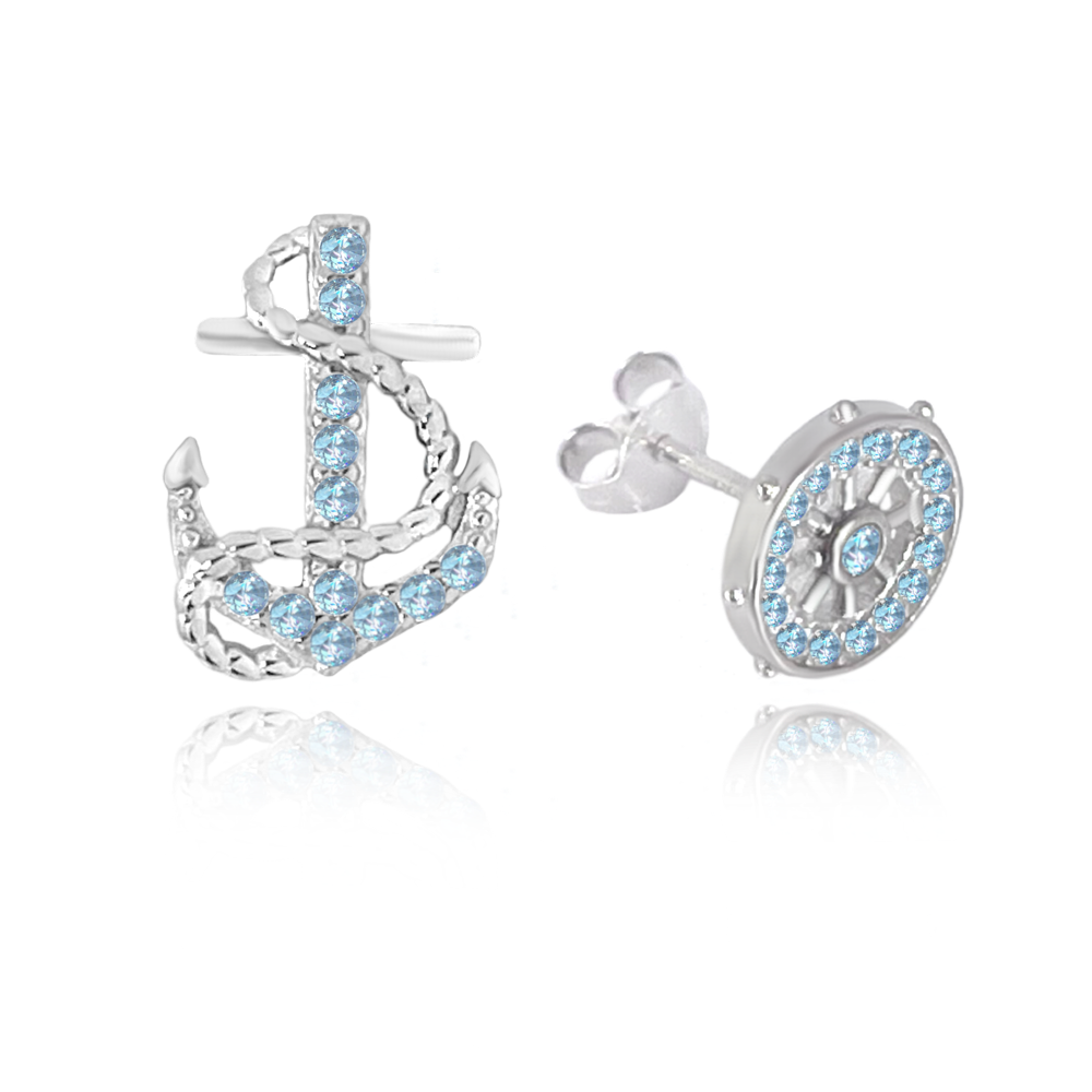 MINET Letní stříbrné náušnice KORMIDLO a KOTVA s modrými zirkony