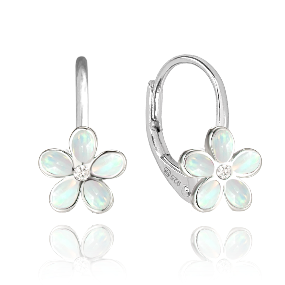 MINET Třpytivé dětské stříbrné náušnice KYTIČKY s bílými opálky a zirkonem