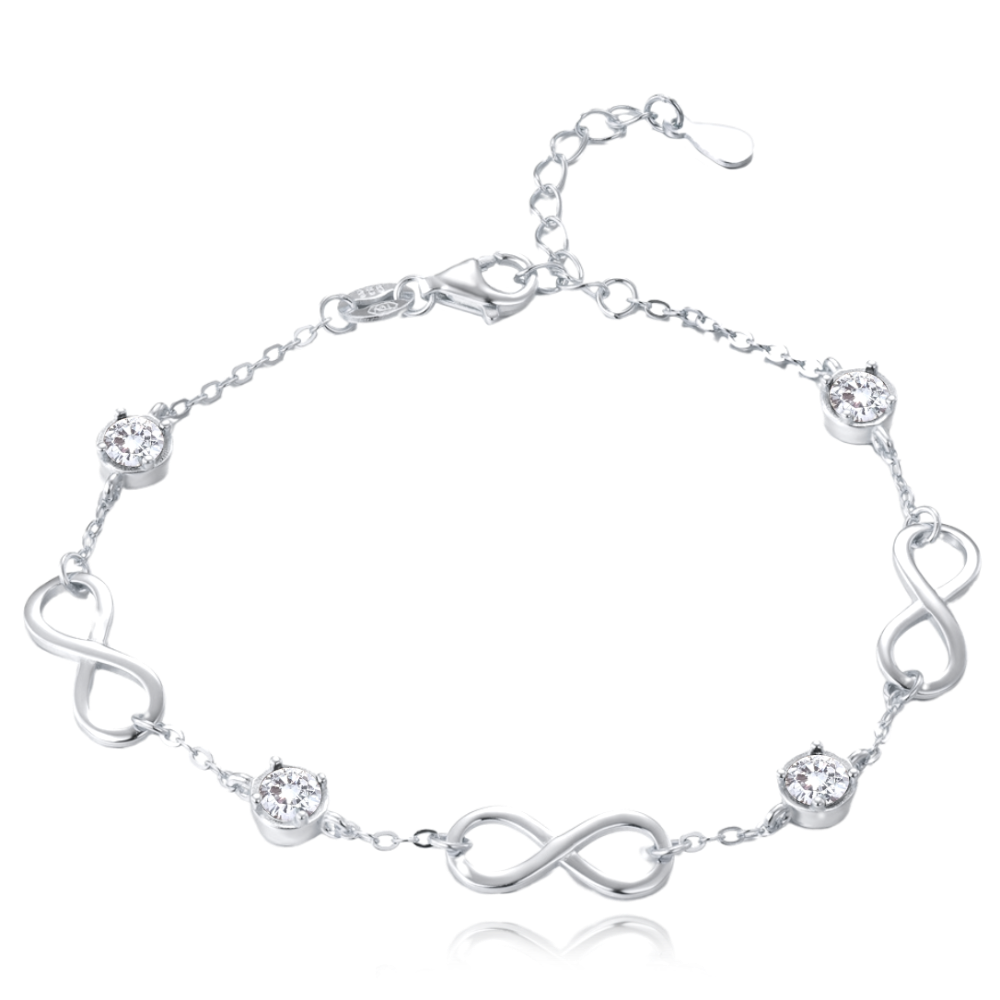 Stříbrný náramek MINET se symboly nekonečna je odrazem současných trendů. Zajímavě posazené kamínky z něj originální udělají doplněk pro každodenní nošení.