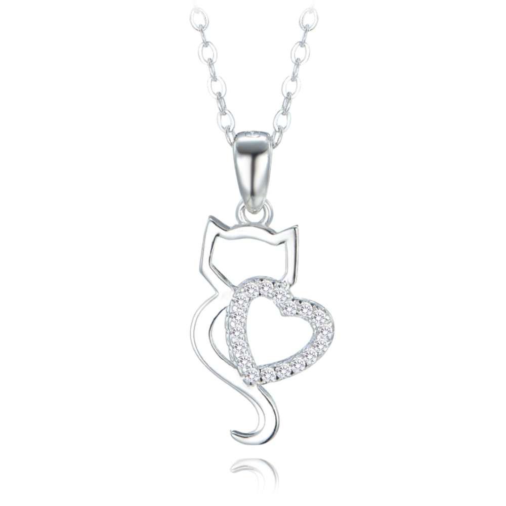 MINET Stříbrný náhrdelník kočka se srdíčkem a bílými zirkony