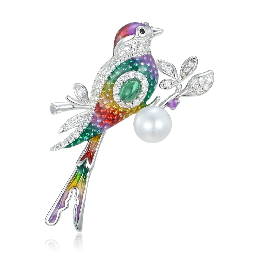 MINET Stříbrná brož barevný ptáček s přírodní perlou