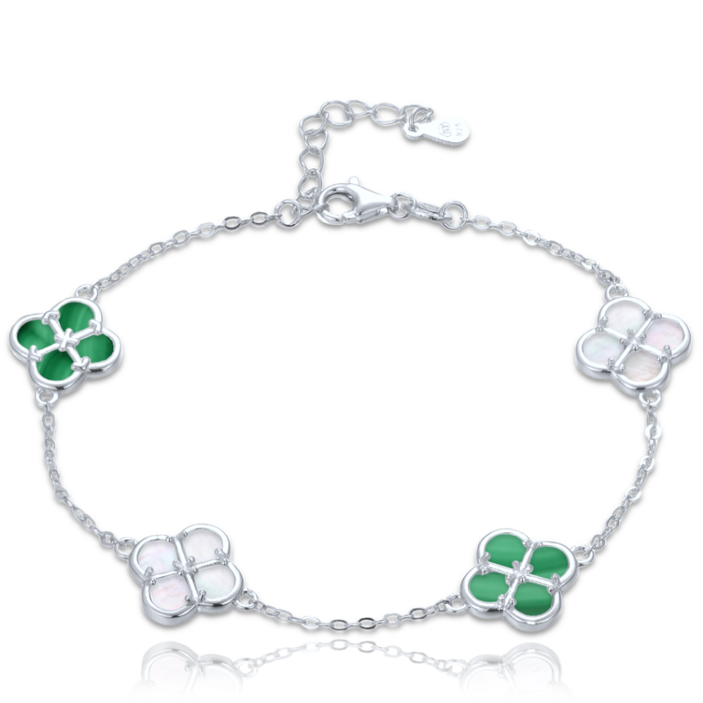MINET Stříbrný náramek čtyřlístky s bílou perletí a malachitem