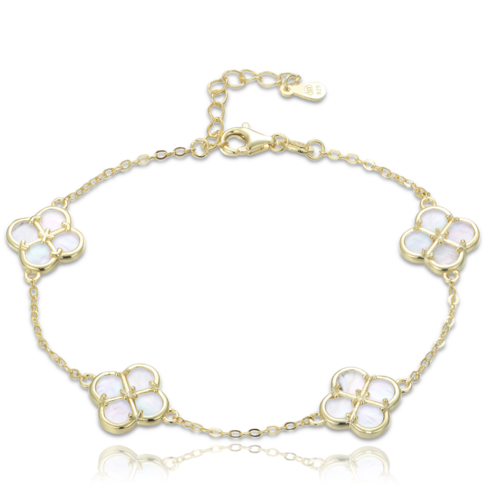 MINET Pozlacený stříbrný náramek čtyřlístky s bílou perletí
